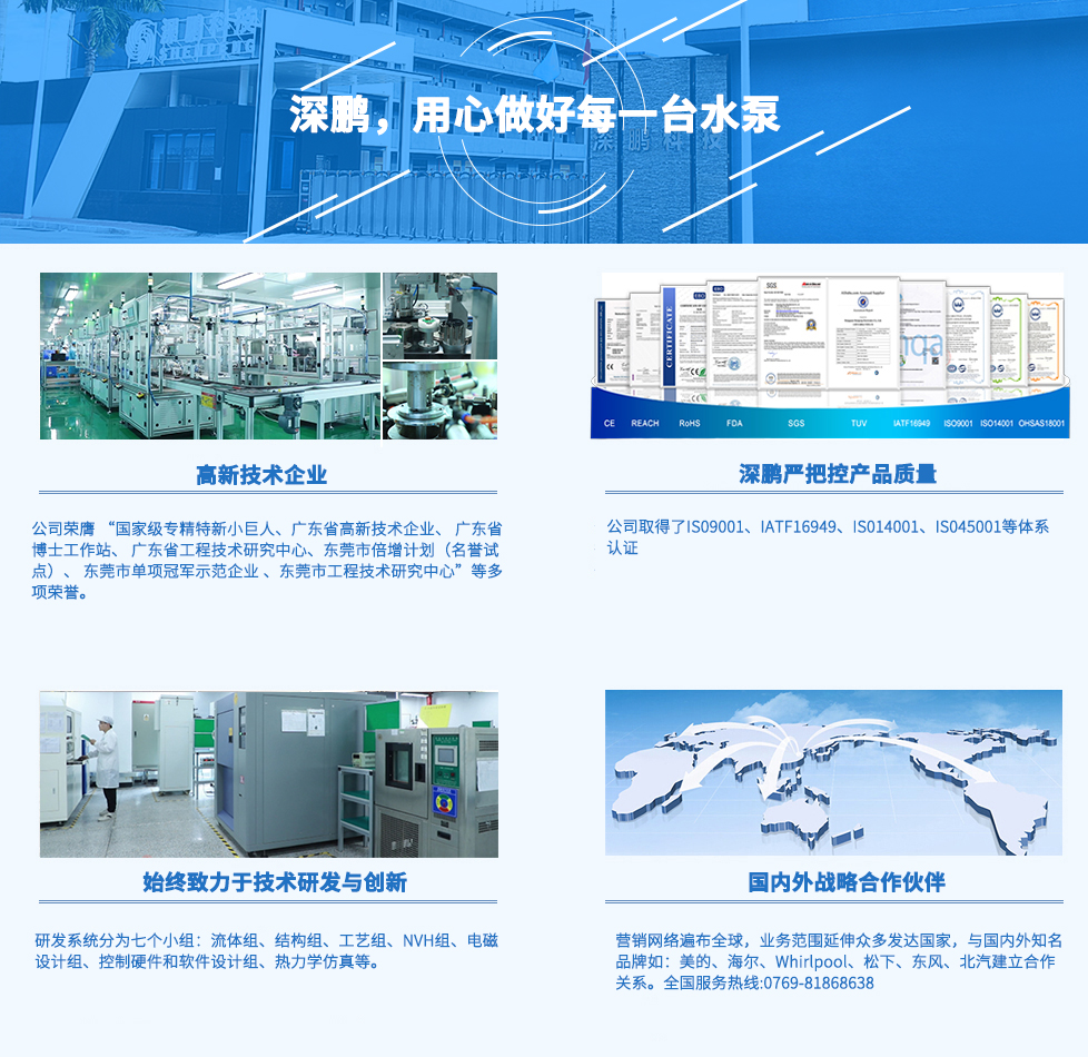 廣東深鵬科技股份有限公司,專業(yè)研發(fā)和生產(chǎn)直流無刷電子水泵,公司坐落于東莞常平。實驗室通過CNAS認(rèn)可資質(zhì),同時通過長安汽車、吉利汽車、上汽通用五菱汽車、美的實驗室審核認(rèn)可。公司擁有20多條電子水泵專業(yè)生產(chǎn)線,全年可生產(chǎn)直流無刷電子水泵1500多萬臺。公司榮膺“國家級專精特新重點小巨人”企業(yè)、“廣東省高新技術(shù)企業(yè)”、“廣東省博士工作站”、“廣東省工程技術(shù)研究中心”、“東莞市倍增計劃(名譽試點)”、“東莞市單項冠軍示范企業(yè)”、“東莞市工程技術(shù)研究中心”等多項榮譽。
